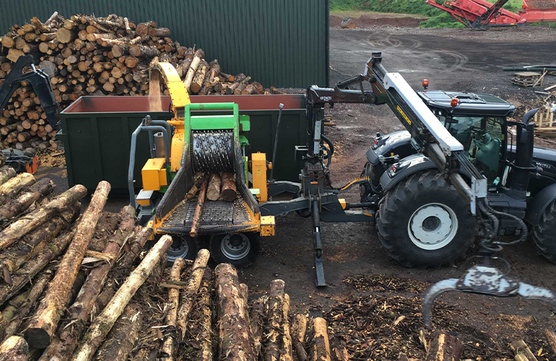 Powered by a 300hp tractor, our machinery is easily manoeuvred around sites and operates where larger lorry mounted chippers may not. For those sites with logistical problems at the processing stage, we may also be able to provide machinery and equipment such as timber forwarders, tractors and trailers for moving and handling of your timber and wood chip.